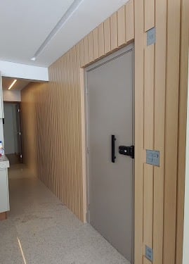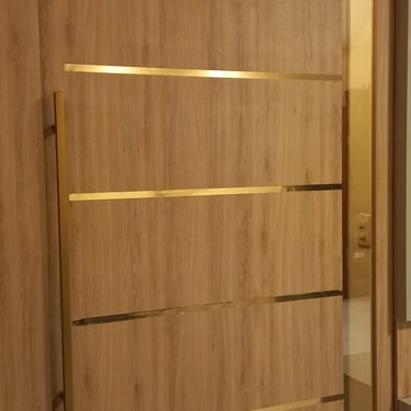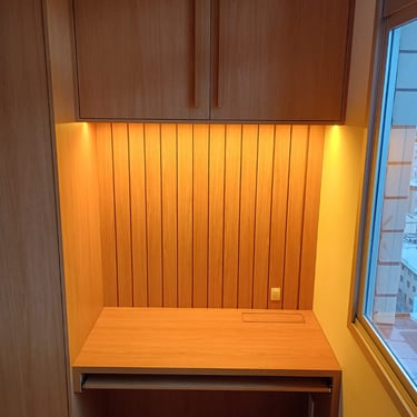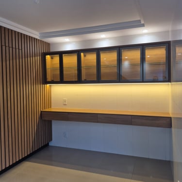Mobiliário planejado para escritório com linhas finas, tons sóbrios e madeira clara, perfeito para concentração e estilo.