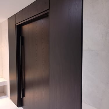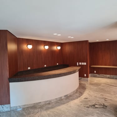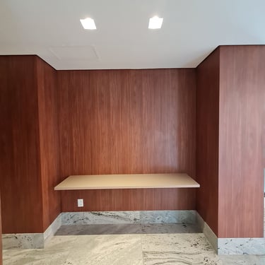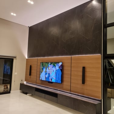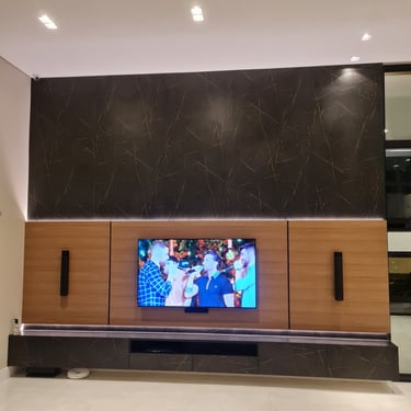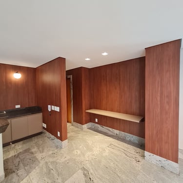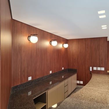 Móveis sob medida em madeira escura para um ambiente acolhedor.